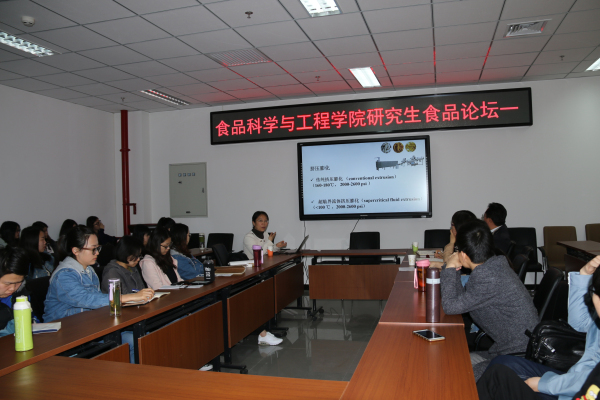 吕莹博士曾多次赴美国康奈尔大学食品科学系访学,本次论坛她主要与同学们分享了自己的访学经历,并交流了自己2016年访学期间在康奈尔大学食品工程实验室开展的超临界流体挤压膨化技术相关实验。吕莹老师对比了超临界流体挤压膨化技术和传统挤压膨化技术,并细致地针对自己利用扁豆做的超临界流体挤压膨化实验结果进行分析。在吕莹老师报告后,与会同学积极互动。