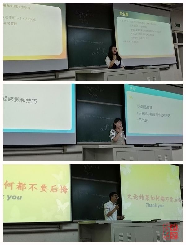 公司还邀请2013级考研员工代表李爽、闫忻莹、刘思佳三位同学分享了自己的考研经验。三位同学从备考的心理准备,院校专业选择,政治、英语、数学、专业课的复习经验,心得体会等几方面向同学们做了深入细致的分享。