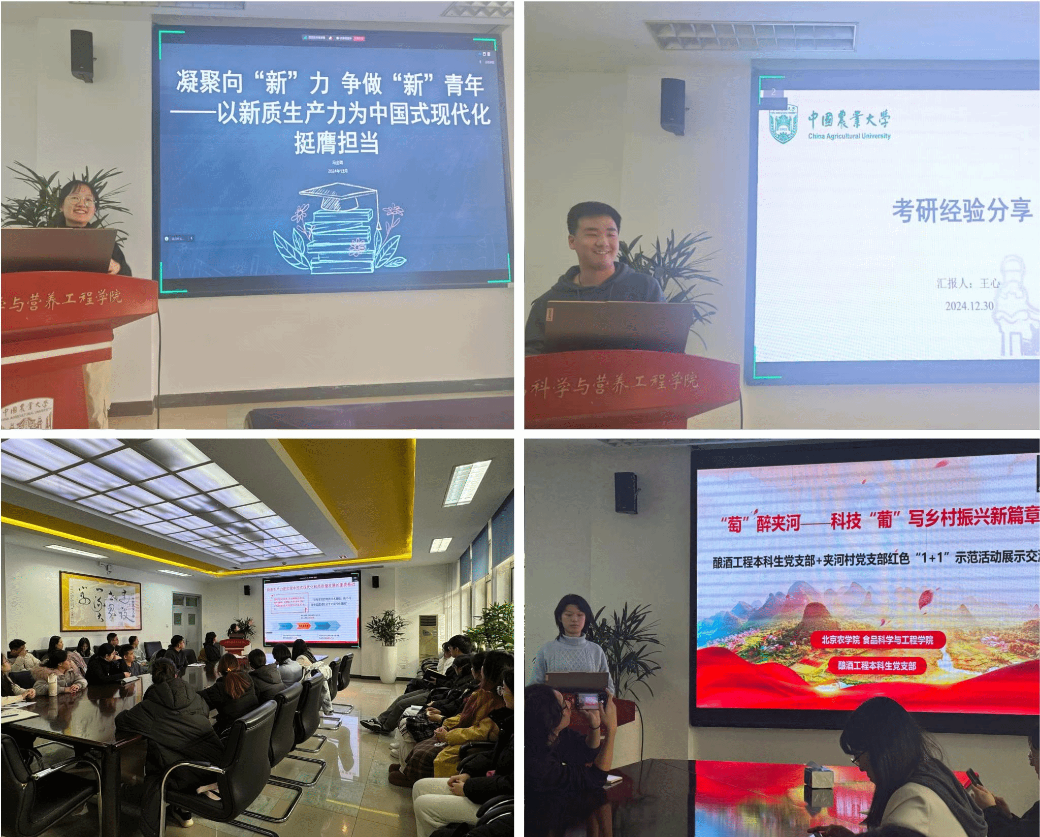 为落实立德树人根本任务,促进高校之间支部共建和学术交流,2024年12月30日,酿酒工程本科生党支部书记凌梦琪带领支部16名党员及积极分子前往中国农业大学,与食品科学与营养工程公司酿酒工程研究生第一党支部联合开展了“红色‘1+1’‘传帮带’”主题党日活动。