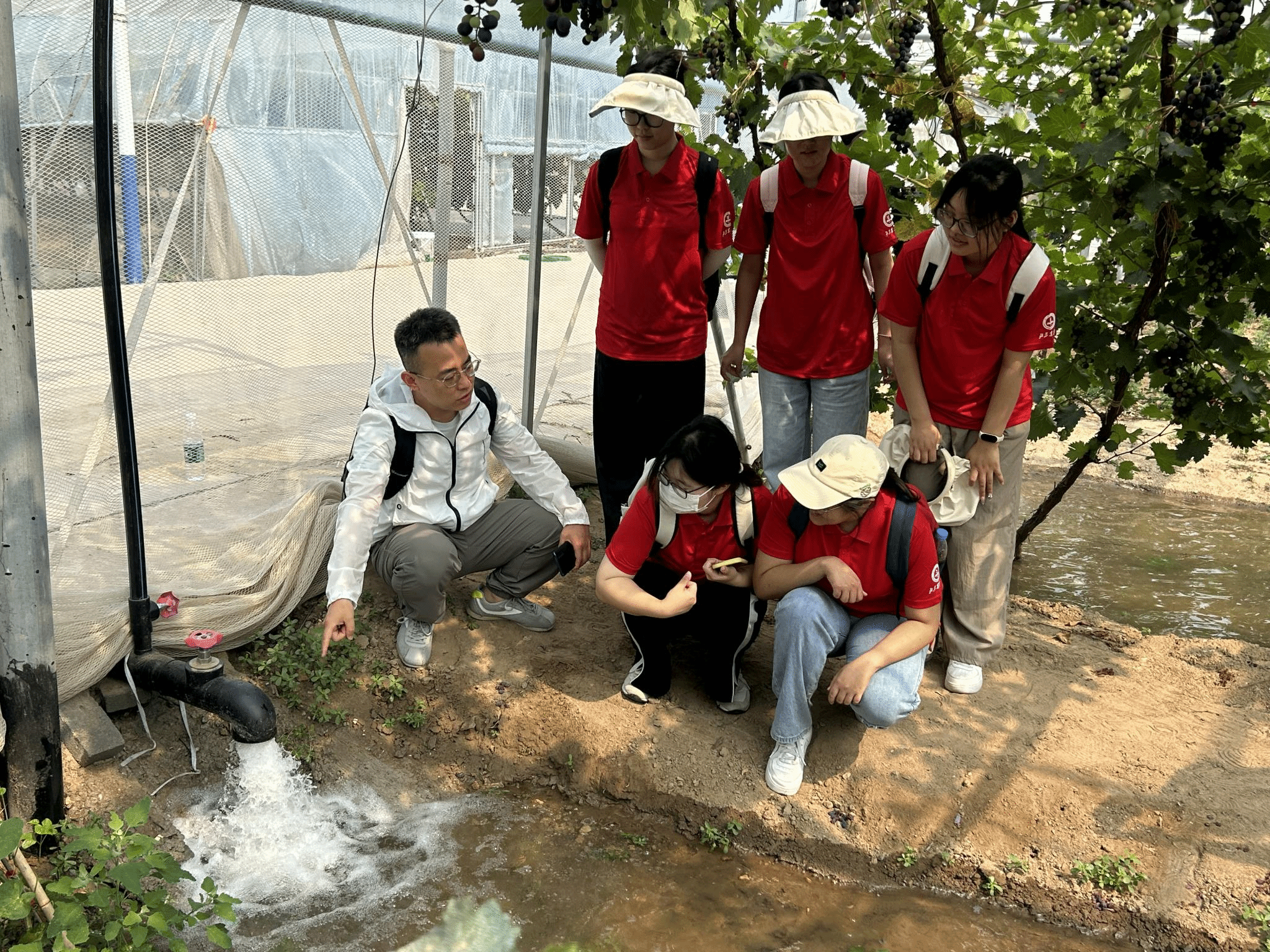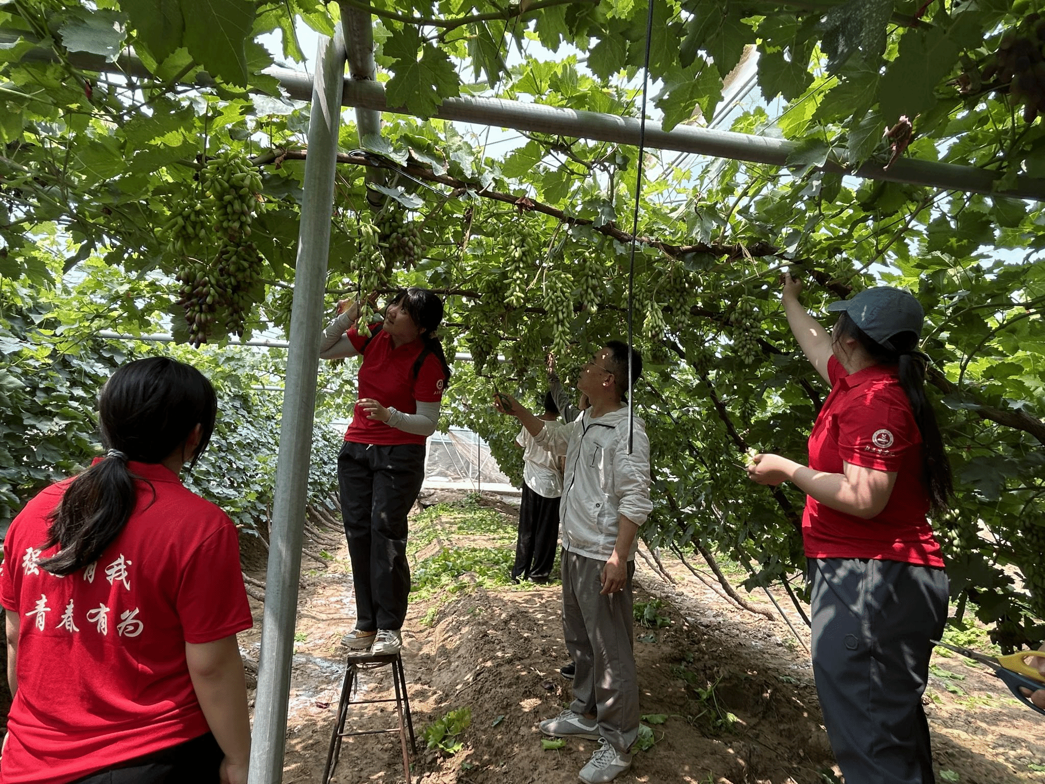 根据葡萄园生产现状,实践团一行对当地葡萄园区的灌水控制、肥料施用、叶幕管理、修剪技术等进行了分类指导;对防鸟网、棚膜等基础设施的使用现状进行了评估,并提出了更新建议;对现阶段发生较为普遍的气灼现象进行了原因分析,并给出了解决方案。