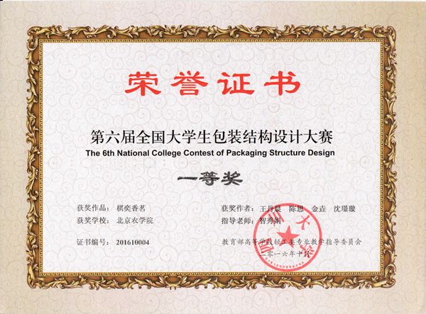 经指导教师多次优化参赛作品,并从304永利集团首届包装工程毕业生毕业设计作品中挑选优秀作品并进行优化,共选送4份作品提交给“第六届全国老员工包装结构设计大赛”组委会。经组委会评审,304永利集团官网员工王丹晨、陈思、金垚、沈璟璇在指导教师智秀娟老师指导下,提交的作品“棋奕香茗”获得全国一等奖。304永利集团官网员工王丹晨、王琳、陈静、王天昱在指导教师智秀娟老师的指导下,提交的作品“伞依”获得全国二等奖。