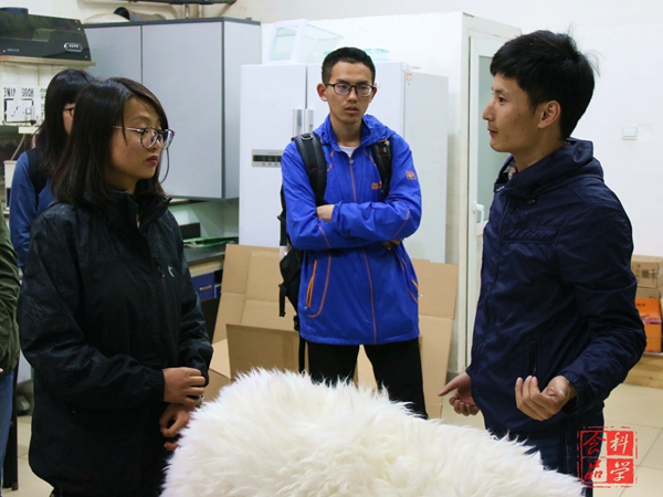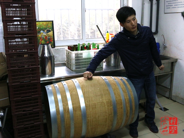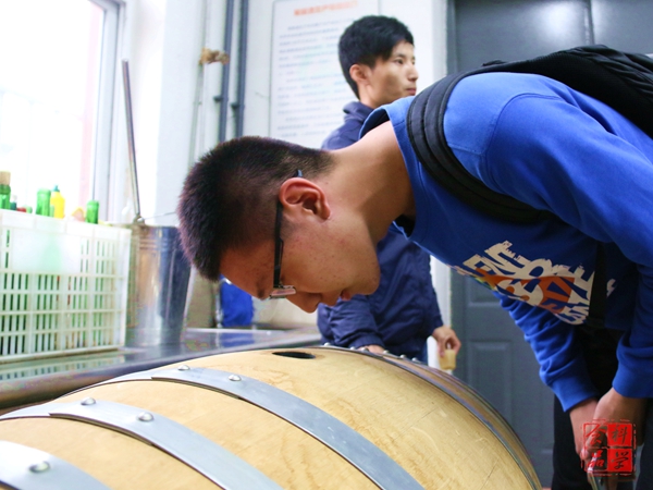 跟随着张亚东学长,我们进入了常年披着神秘面纱的葡萄酒生产车间,车间内陈列着各种器具,一时令人不知从何看起。随后张亚东学长介绍了这些器具的作用和使用方法。葡萄酒的制作讲究沉稳而精细,主要分为挑选葡萄、破碎果实、发酵、压榨、装桶这几个步骤。第一步对葡萄进行严格仔细的挑选,一桶酒可能会因为第一步的疏忽大意而失去风味。破碎机处理后果酱状的葡萄放入发酵缸通过发酵,所得到的果汁在压榨后进入橡木桶……张亚东将这些器具的使用方法为大家进行演示,并且介绍了很多关于实际生产葡萄酒过程中的细节,例如不同的橡木桶会产生不同口感的葡萄酒,这神奇的力量使得每一瓶葡萄酒都拥有自己独特的风格,随着他的讲解,同学们对葡萄酒都产生了很大的兴趣。