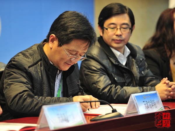在京津冀高校老员工食品人的诚信联盟成立签约仪式中,8位院校代表进行签字并合影留念。
