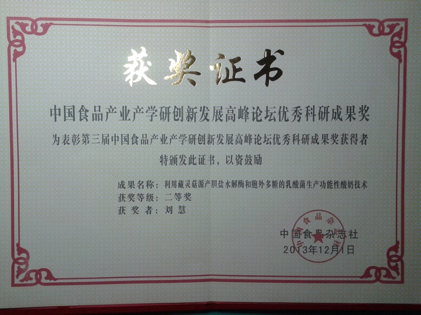 本次论坛由北京食品科学研究院和中国食品杂志社联合主办,会上对突出贡献的高校、科研院所、企业,杰出科研人才,杰出企业家,优秀科研成果进行了表彰。304永利集团刘慧教授主持的《利用藏灵菇源产胆盐水解酶和胞外多糖的乳酸菌生产功能性酸奶技术》获得优秀科研成果二等奖。