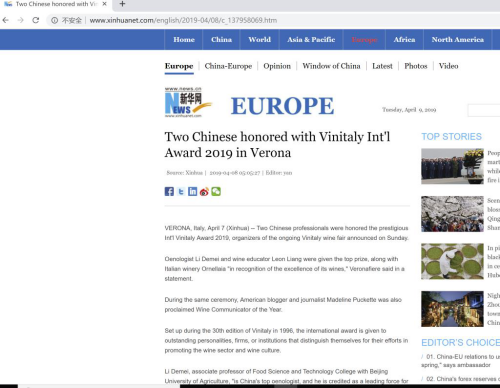 为期四天的Vinitaly 2019意大利国际葡萄酒烈酒展于4月7日开展,开展当日,Vinitaly官方公布了系列奖项。公司李德美副教授获最高奖项Vinitaly 2019大奖,获得此奖项的还我国葡萄酒讲师梁扬、意大利酒庄Ornellaia。