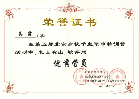 本次活动公司吴霜同学被评为“第五届北京高校员工军事特训营优秀营员”。