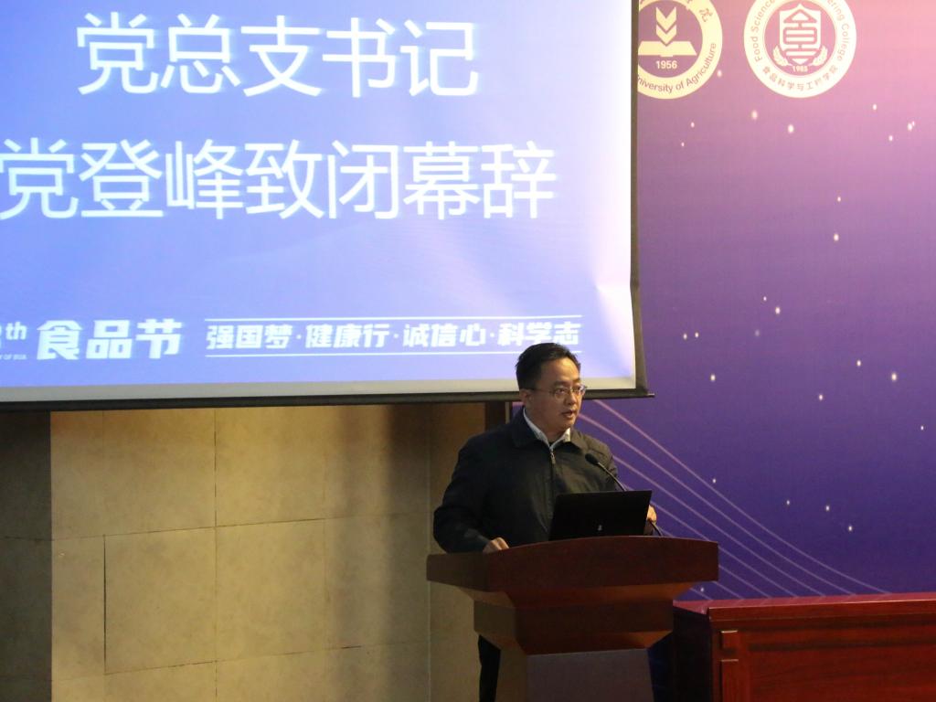 最后,公司党总支书记党登峰致闭幕辞。党书记首先感谢所有在抗疫工作和食品节筹备中辛苦付出的师生们,对食品节获奖师生表示祝贺。随后,党书记从责任与担当、创新与发展等方面分析了食品行业未来的机遇和挑战,激励师生要有责任担当和家国情怀,在抗疫和专业中有所作为。特别是大一新生们,要在学长打下的坚实基础上,努力学习、勤于实践,让第14届食品节办得更好。
