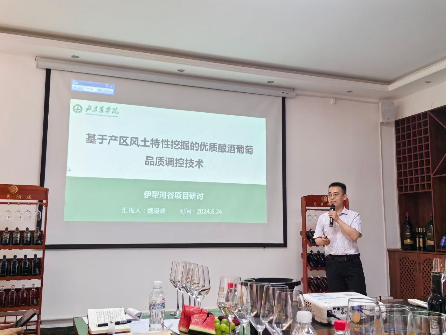 魏晓峰作了题为“基于产区风土特性挖掘的优质酿酒葡萄品质调控技术”的报告,报告对“产区风土”的含义、意义及表达方式进行了深入分析,从树形、修剪、叶幕、果际微环境、土壤、水肥等方面对优质酿酒葡萄品质调控技术进行了案例展示,对由公司研究团队承担的“伊犁河谷产区葡萄酒中关键物质测定及分析”进行了项目回顾及未来展望。