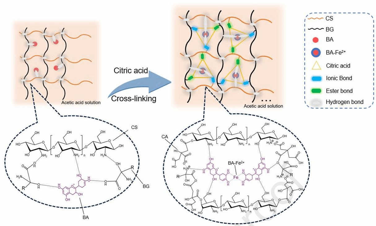 Fig. 6. Chemical structures of BA and BA-Fe2+binding to the matrix before and after citric acid crosslinking.