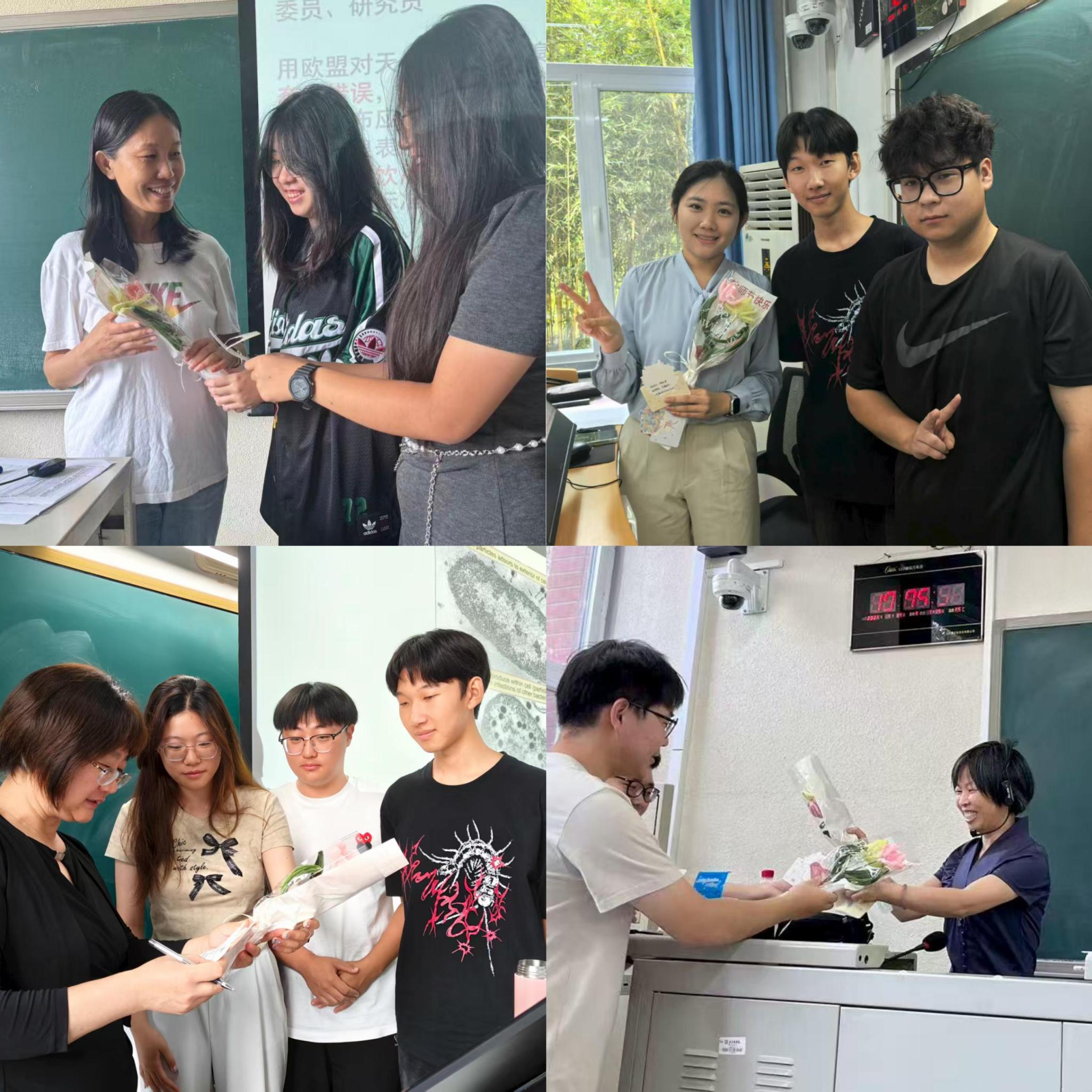 上课前,同学们用亲手制作的花束与贺卡,向任课教师传递心意,送达祝福。课堂里的知识传授,化作了双向奔赴的温暖。